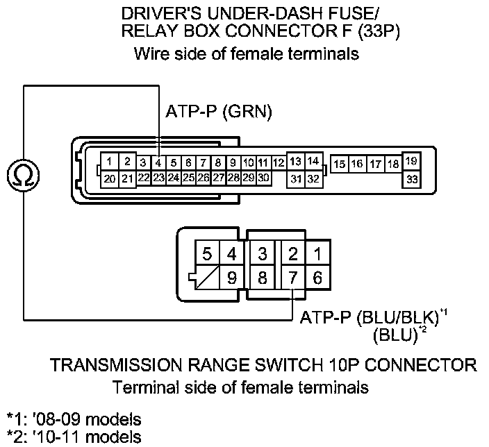 22. Check for continuity between driver's under-dash fuse/relay box connector F (33P) terminal No. 4 and transmission range switch 10P connector terminal No. 7.