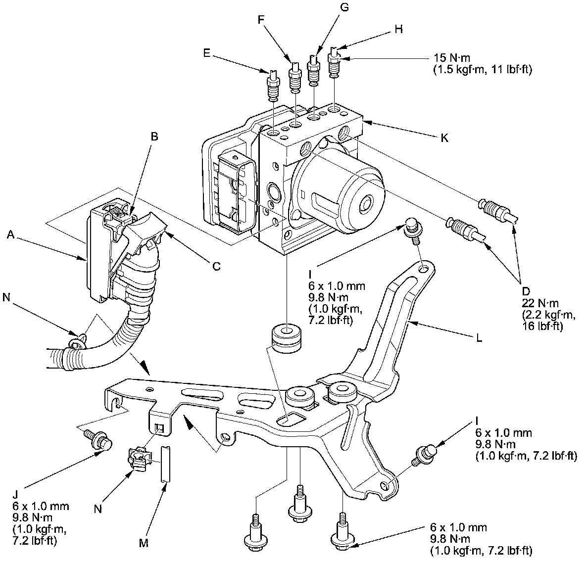 5. Remove the 6 x 12 mm flange bolts (I) and 6 x 16 mm flange bolt (J), then remove the VSA modulator-control unit (K) with the bracket (L) from the body.
