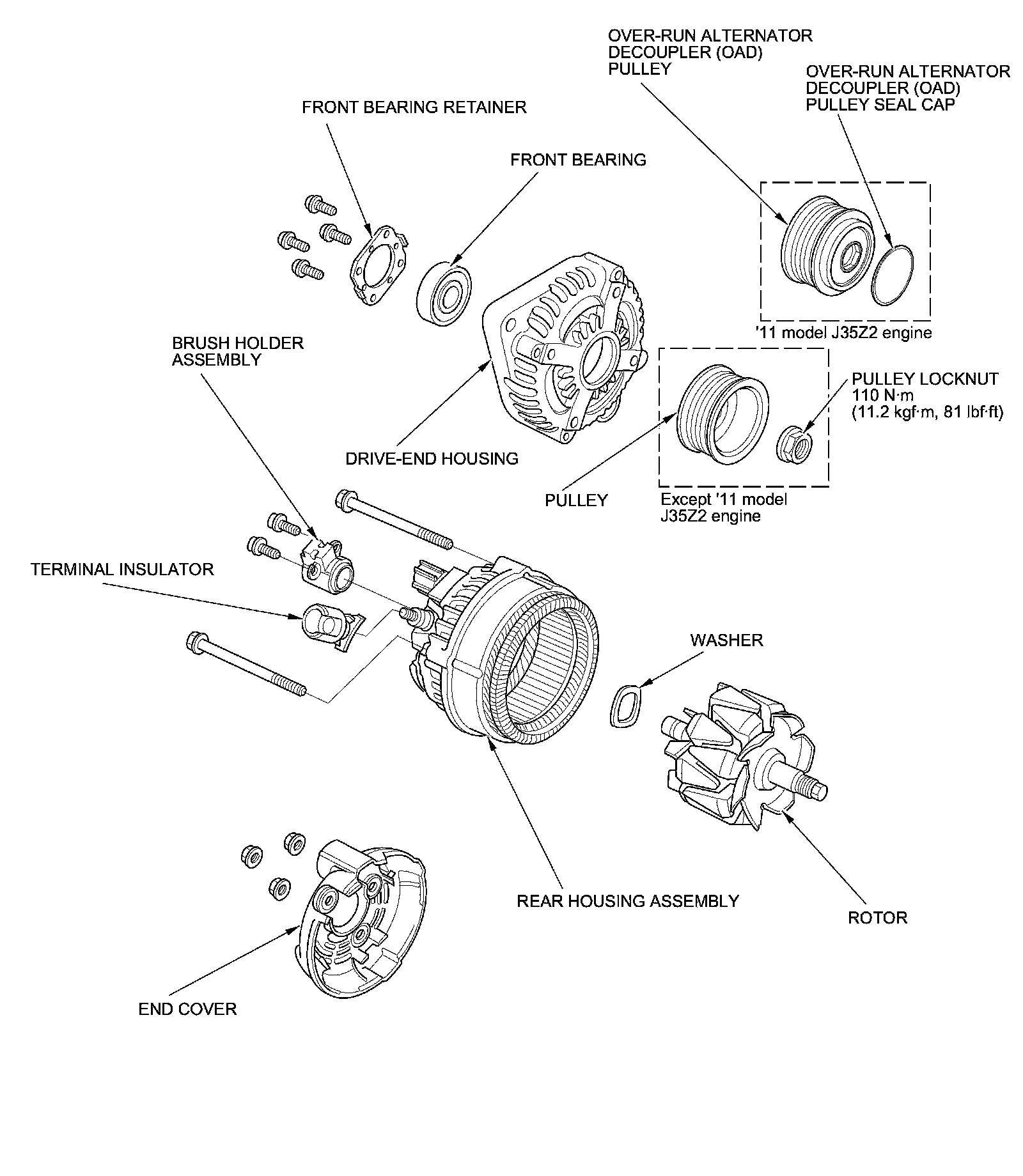 17. Except '11 model J35Z2 engine: If you removed the pulley, put the rotor in the drive-end housing, then torque its locknut to 110 Nm (11.2 kg-m, 81.0 lb-ft).
