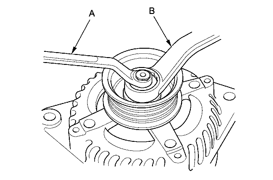 3. Except '11 model J35Z2 engine: If the front bearing needs replacing, remove the pulley locknut with a 10 mm wrench (A) and a 22 mm wrench (B). If necessary, use an impact wrench.