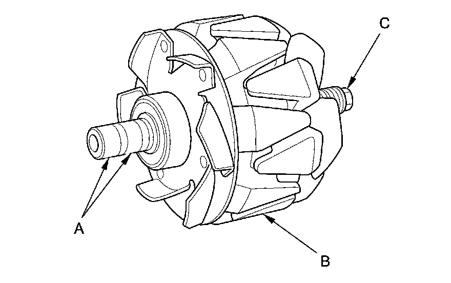 16. Check for continuity between each slip ring and the rotor (B) and the rotor shaft (C).