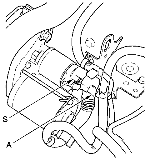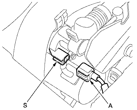 10. Make sure the shift lever is in neutral (M/T model) or P or N (A/T model), then disconnect the connector (A) from the starter S terminal. Connect a jumper wire from the battery positive terminal to the S terminal.