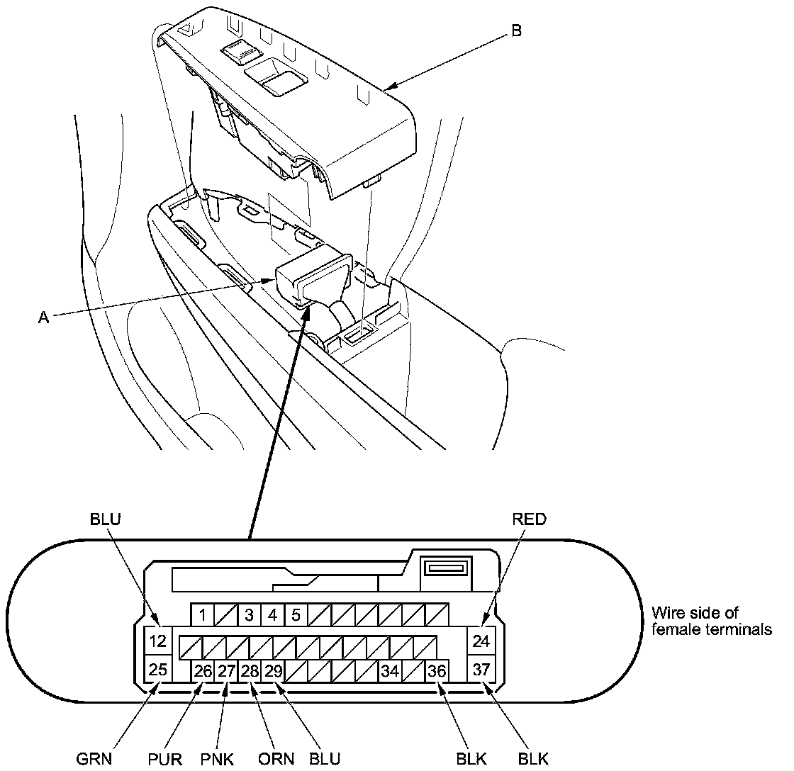 2. Disconnect the 37P connector (A) from the front passenger's power window switch (B).