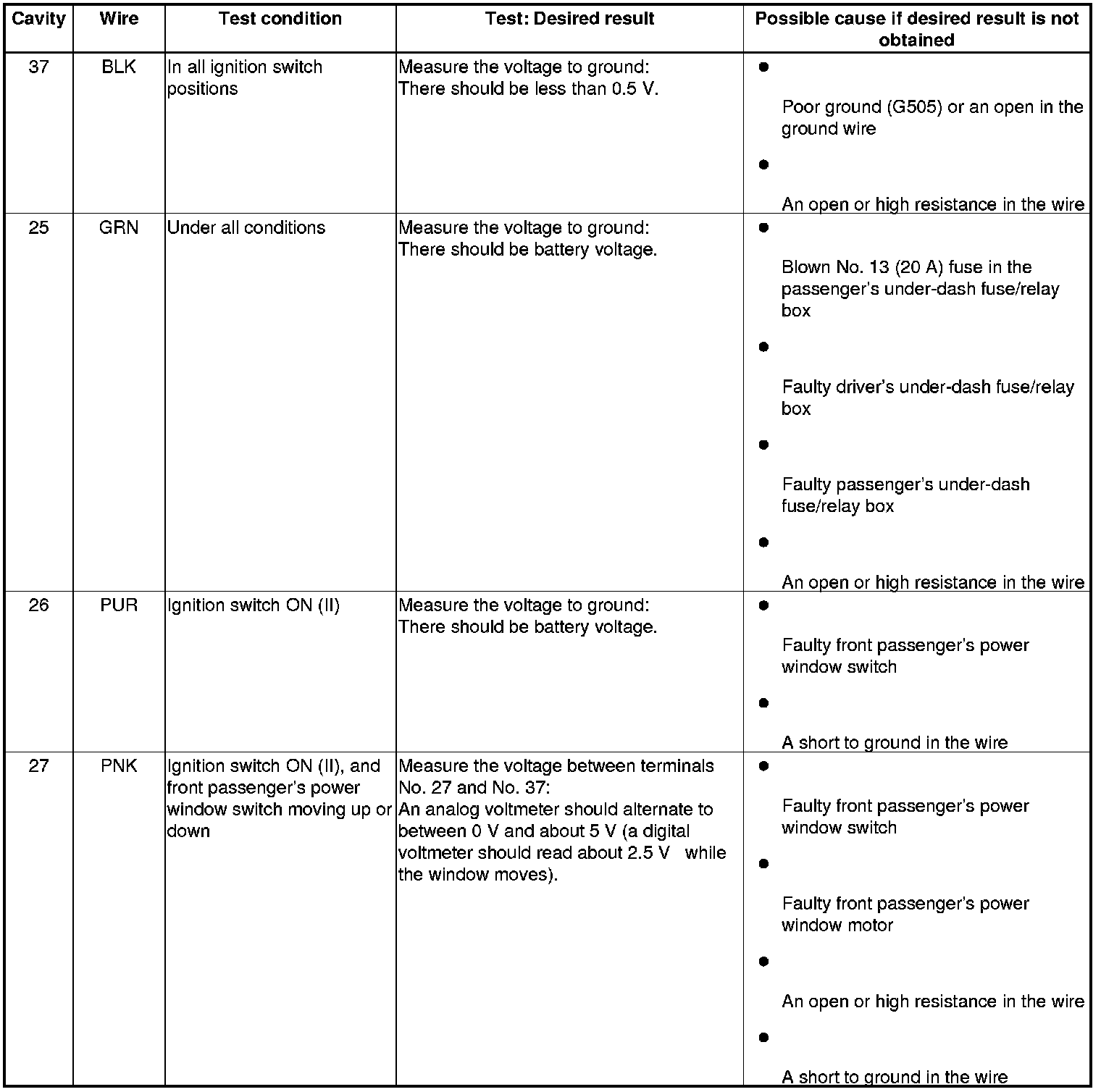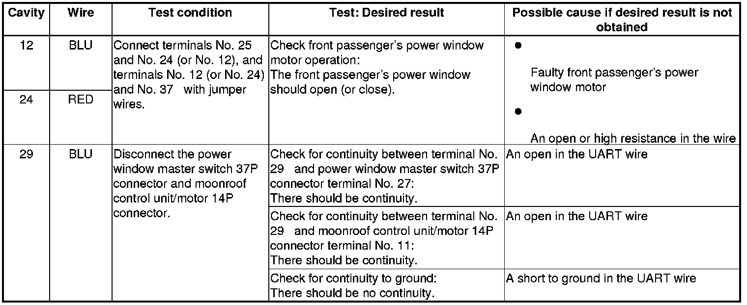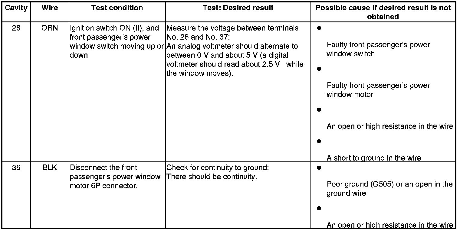 - If all the input tests prove OK, replace the front passenger's power window switch, 4-door, 2-door, then go to step 7.