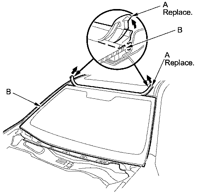 2. Remove the windshield molding (A) from the upper edge of the windshield (B). If necessary, cut the windshield molding with a utility knife.