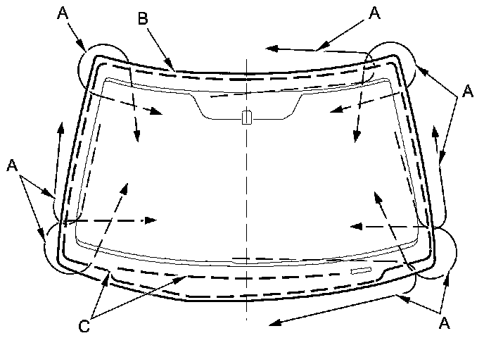 18. Apply a light coat of glass primer to the windshield (A) along the edge of the windshield molding (B) and the rubber dams (C) as shown, then lightly wipe it off with gauze or cheesecloth: