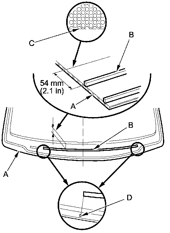 12. Apply glass primer to the upper clips mounting areas on the windshield (B), and let it dry. Remove the adhesive backing and attach the rubber dam A and the upper clips (C) to the inside of the windshield as shown: