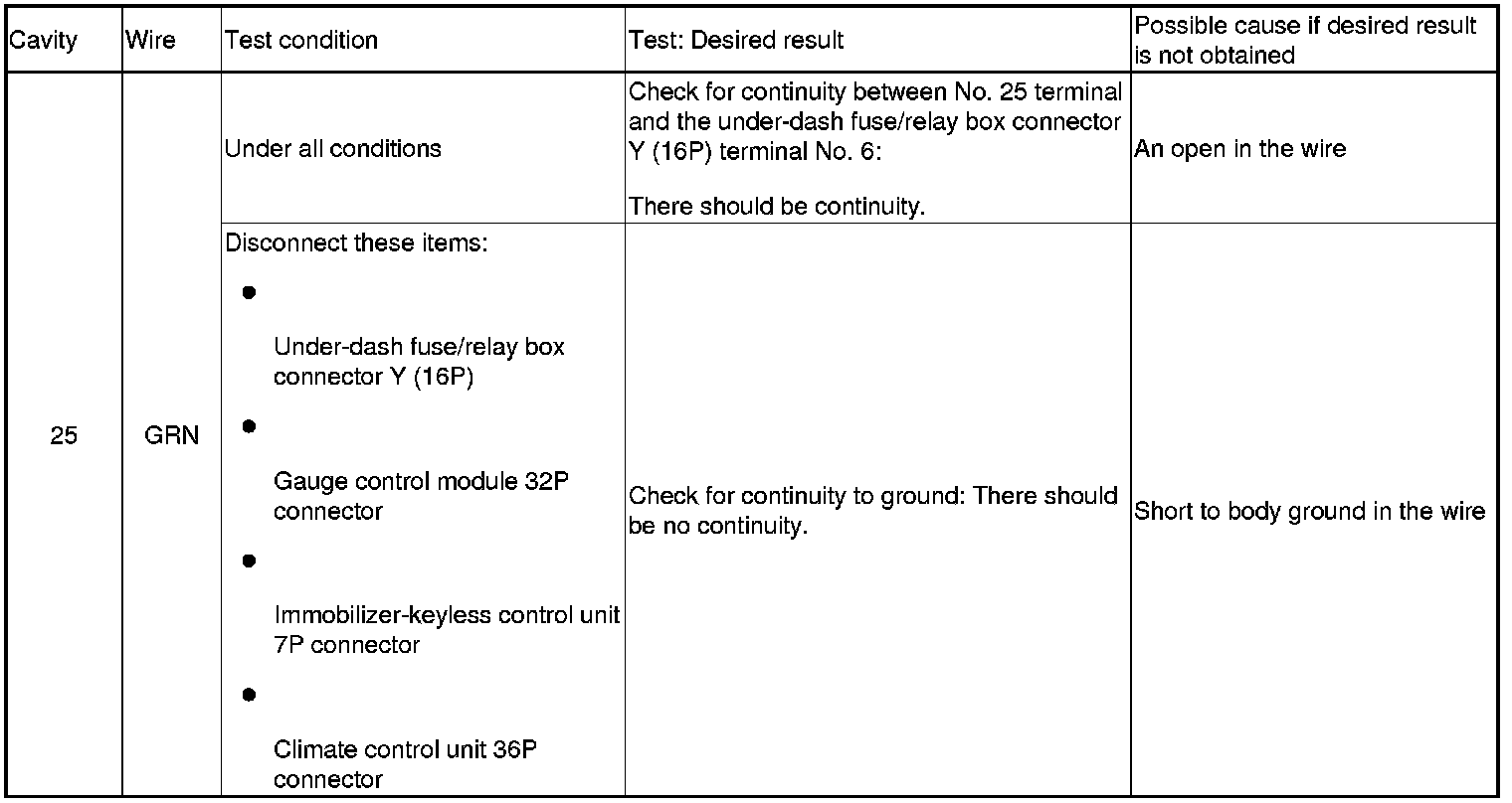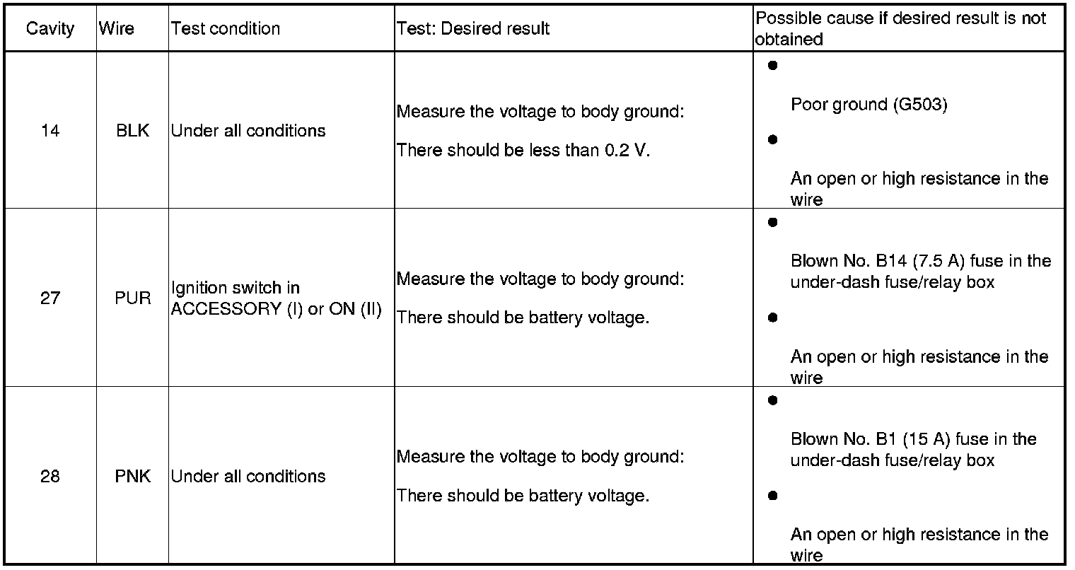 6. Reconnect the connector and make these input tests at the connector under the test conditions listed.
