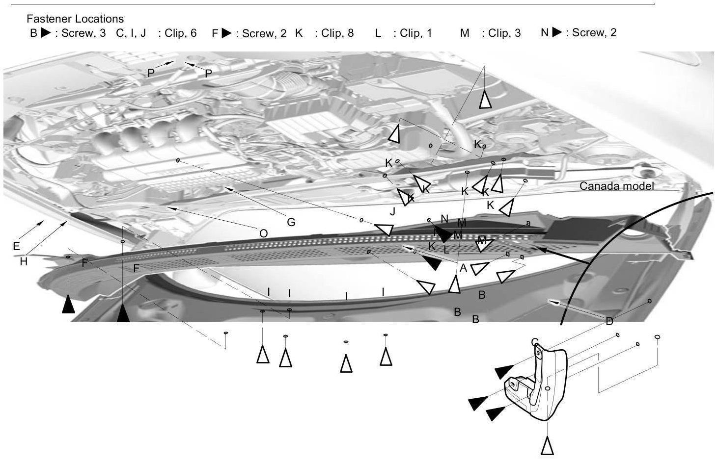 1. Canada models: On the back of the wheel arch, remove the screws (B) and the clip (C), then remove the front splash guard (D).