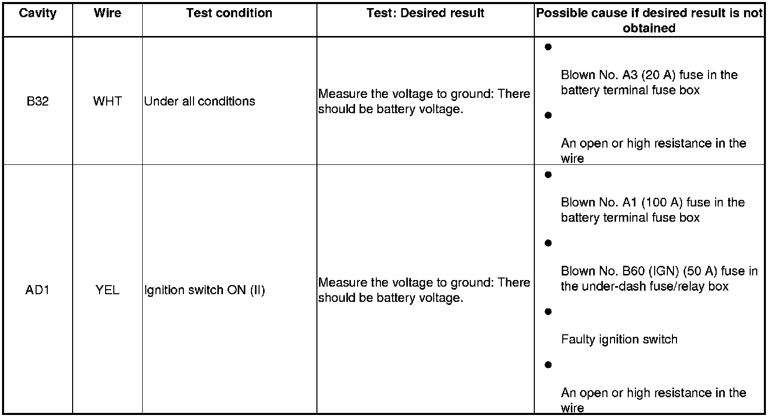 - Before testing, check the No. B1 (15 A), No. B20 (15 A), No. B22 (7.5 A), No. B23 (10A), No. B24 (10A), No. B27 (20 A), No. B35 (7.5 A), No. B36 (10 A), No. B45 (20 A), No. B49 (7.5 A), and No. B60 (50 A) fuses in the under-dash fuse/relay box.