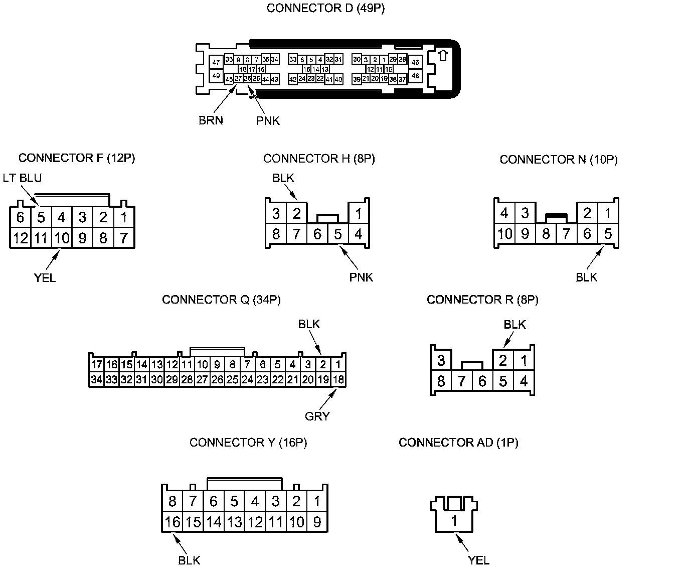 3. Disconnect the under-dash fuse/relay box connectors D, F, H, N, Q, R, Y, and AD.