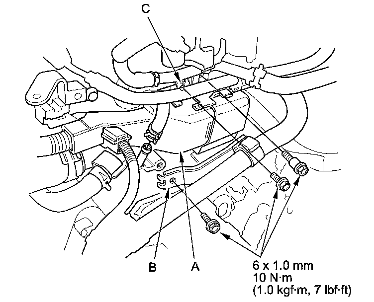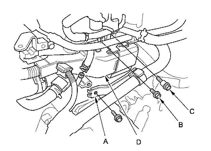 6. Install the heater hose bracket (B) and the ground cable (C).