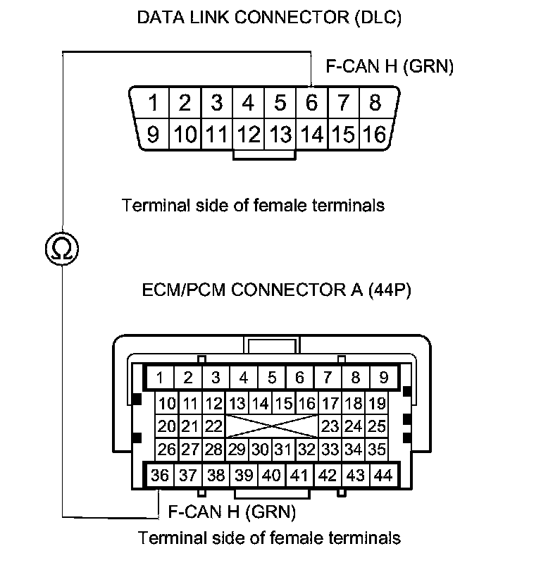 33. Check for continuity between ECM/PCM connector terminal A36 and DLC terminal No. 6.