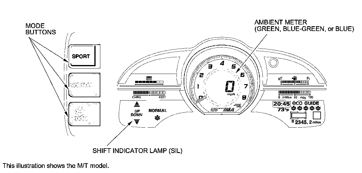 In Sport mode, the ambient meter color is red at all times, and the shift indicator lamp (SIL) stays off (M/T).