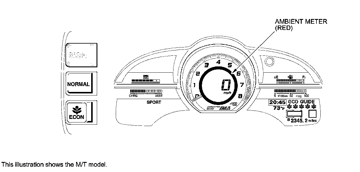 The ambient meter is the ring of color around the speedometer. In Normal or ECON mode, it changes color based on data the ECM/PCM receives from various control units and sensors. The ECM/PCM calculates this data, forms an Eco drive profile, and then sends the profile to the gauge control module via F-CAN. When the gauge control module receives the Eco drive profile data, it responds by changing the background color of the speedometer. During low fuel economy, the ambient meter is blue; at medium fuel economy, the meter is blue-green; and at high fuel economy, it's green.