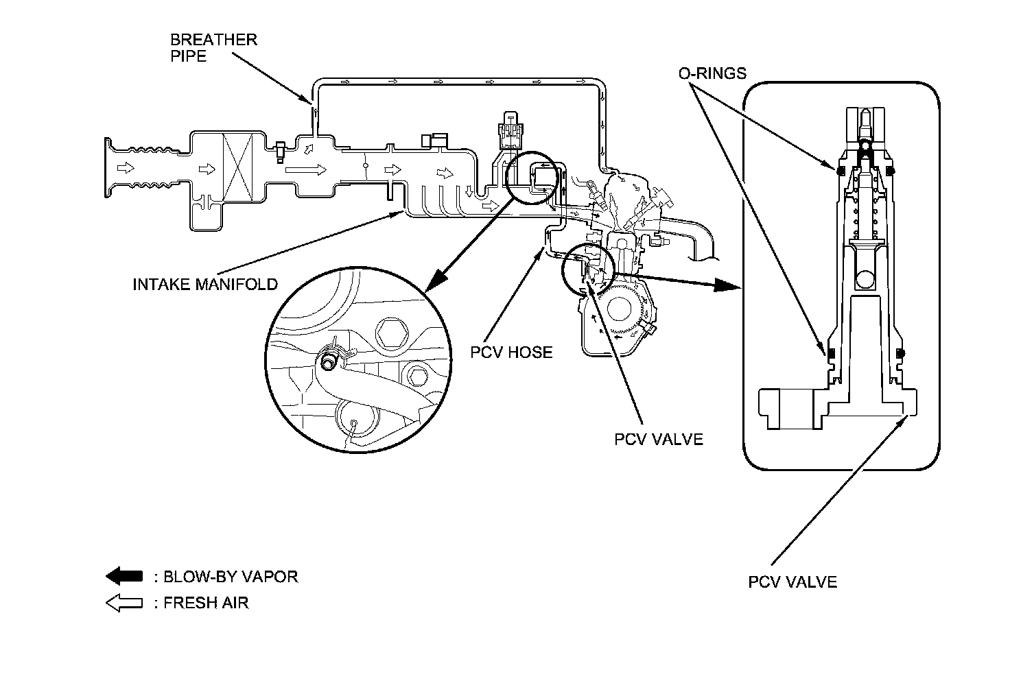 The PCV valve prevents blow-by gases from escaping into the atmosphere by venting them into the intake manifold.