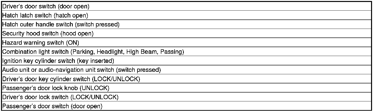NOTE: If any control unit is faulty and will not wake up, several circuits in the system will malfunction at the same time. The table below is a list of the switches and the input signals that wake them up.
