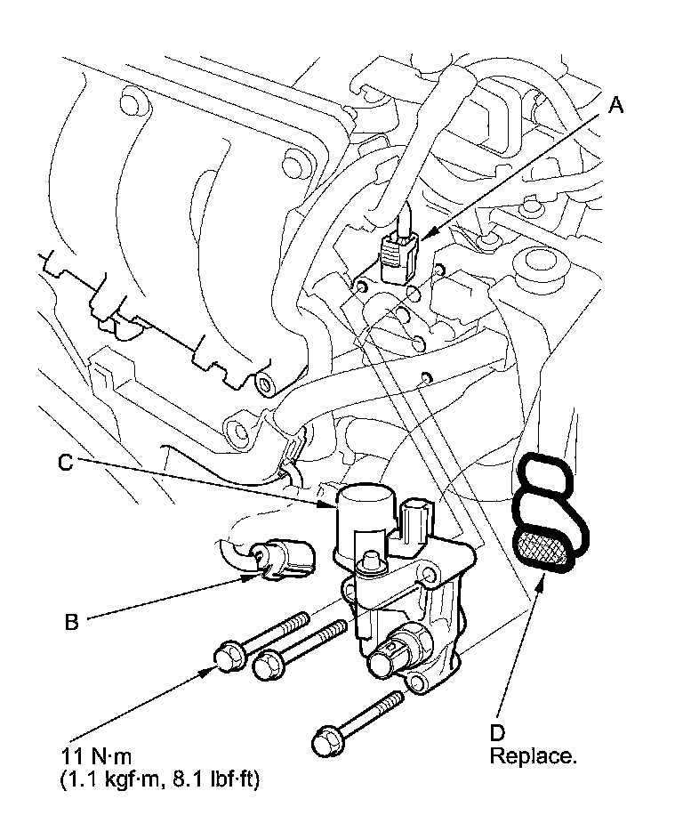 3. Remove the rocker arm oil control valve assembly (C) and the rocker arm oil control valve filter (D).