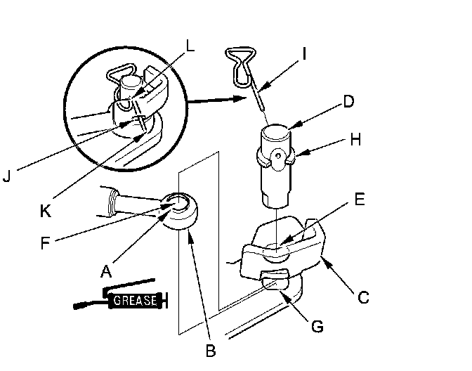 13. Insert the lock pin (I) in the direction shown through the control pin hole and out the opening (J) of the selector control lever so that the hooked end (K) of the lock pin locks into the countersunk hole (L) of the control pin.
