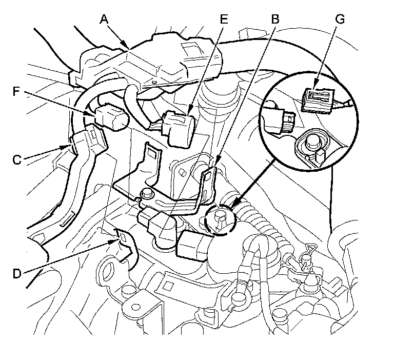 15. Connect the transmission range switch 8P connector (E), the CVT output shaft (driven pulley) speed sensor 3P connector (F), and the vehicle speed sensor 3P connector (G).