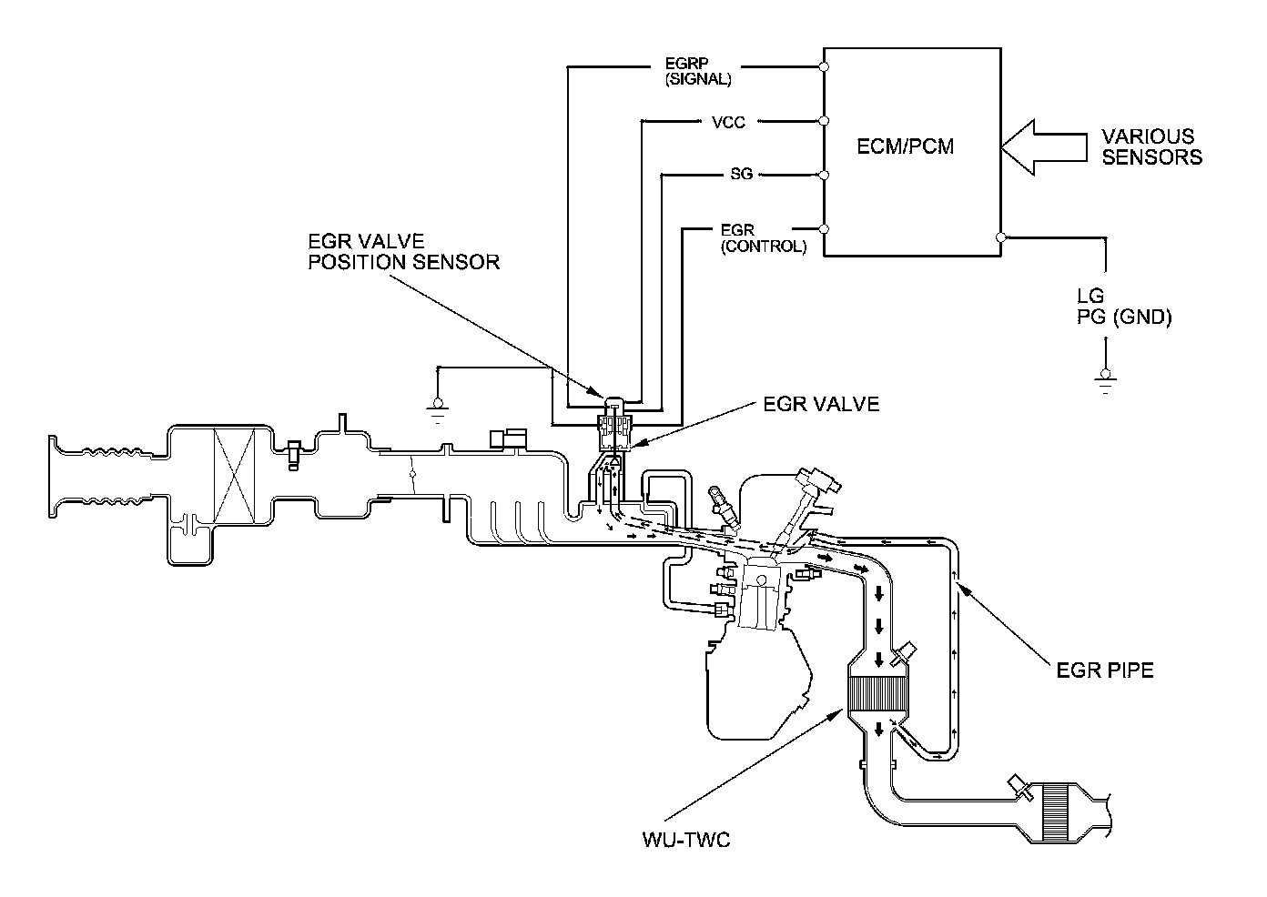 The EGR system reduces oxides of nitrogen (NOx) emissions by recirculating exhaust gas through the EGR pipe and the intake manifold, and into the combustion chambers. Routing the exhaust gas through the EGR pipe helps to prevent carbon deposits from forming in the intake manifold and the throttle body. The ECM/PCM memory contains the ideal EGR valve positions for various operating conditions.