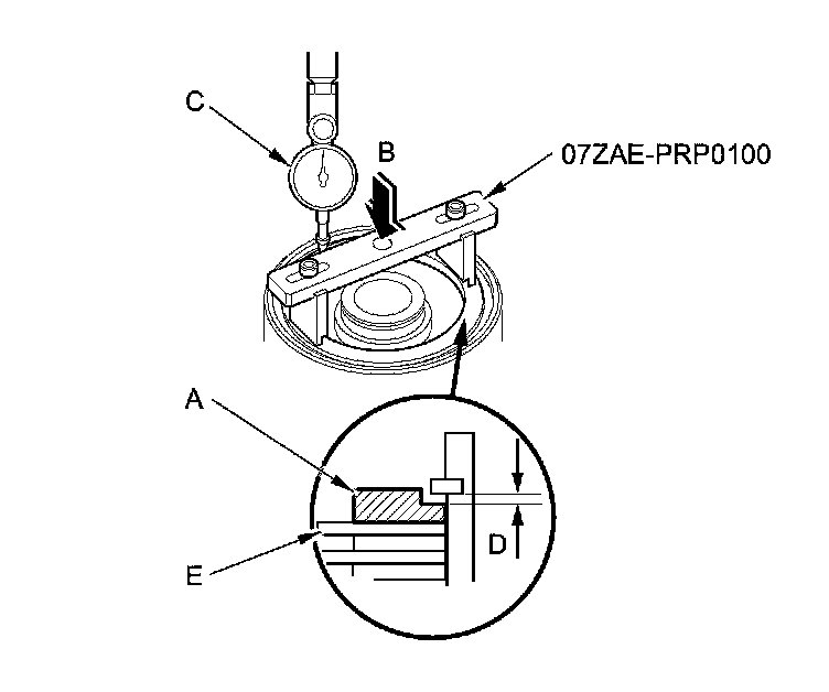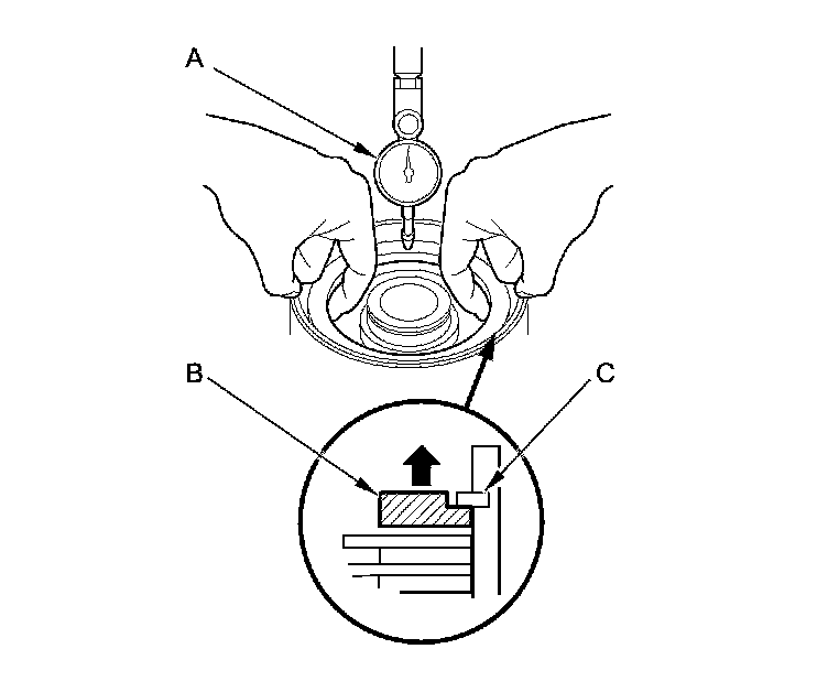 2. Zero the dial indicator with the clutch end-plate is lifted up to the snap ring (C).