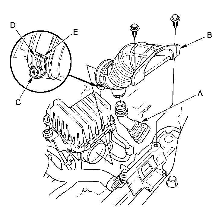 NOTE: When tightening the screw (C) of the hose band, align the edge of the hose band (D) with the mark (E) painted on the hose band. If you tighten the screw over the mark, replace the hose band.