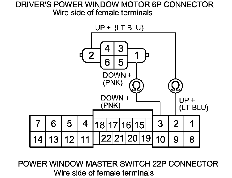 6. Check for continuity between the power window master switch 22P connector terminals and the driver's power window motor 6P connector terminals as shown: