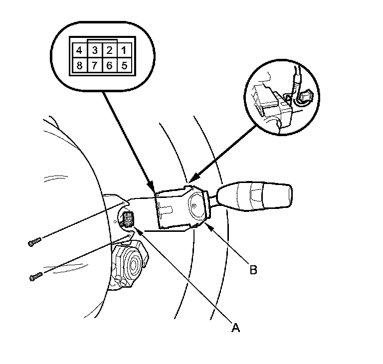 2. Disconnect the 8P connector (A) from the wiper/washer switch (B).
