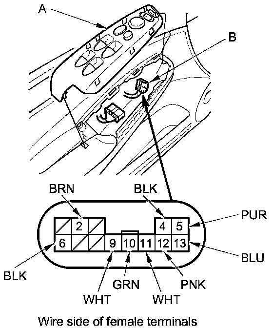 2. Disconnect the 13P connector (B) from the power mirror switch.