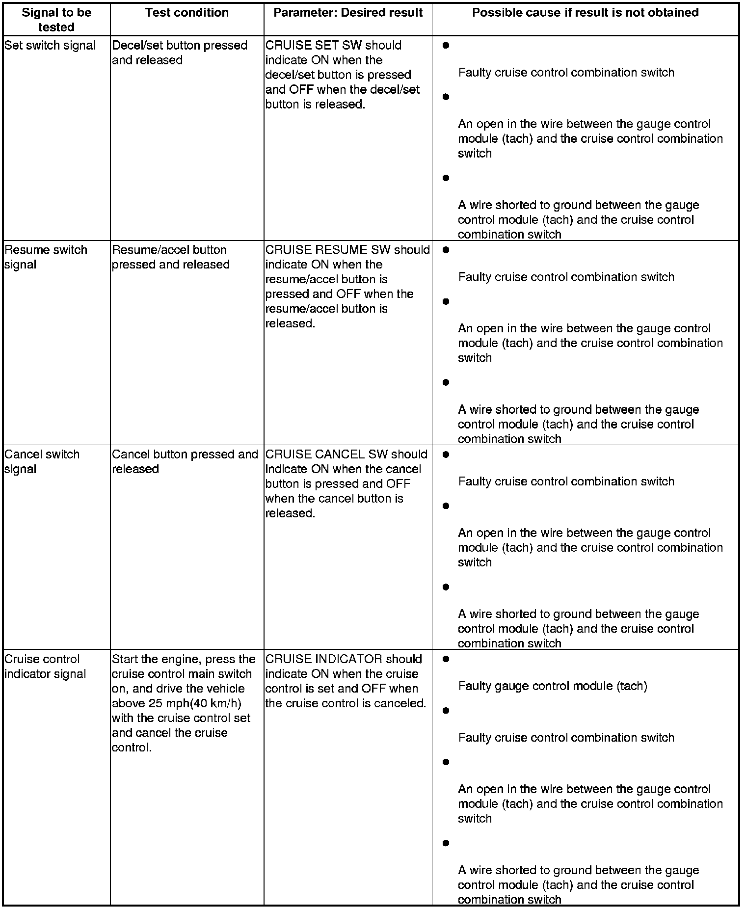 NOTE: Intermittent failures are often caused by loose circuit connections. While monitoring cruise control inputs, flex the circuit wires, and note if any of the test results change.