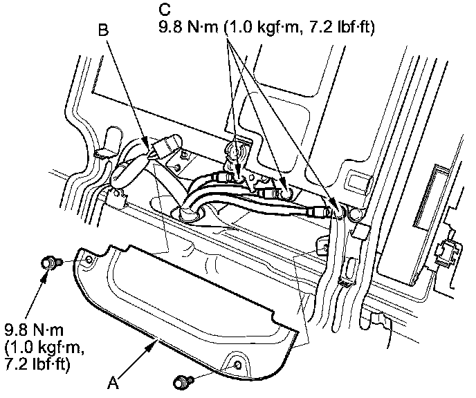 6. Remove the A/C compressor power cable connector (B), and the motor power cables (C), then wrap them with insulating tape.