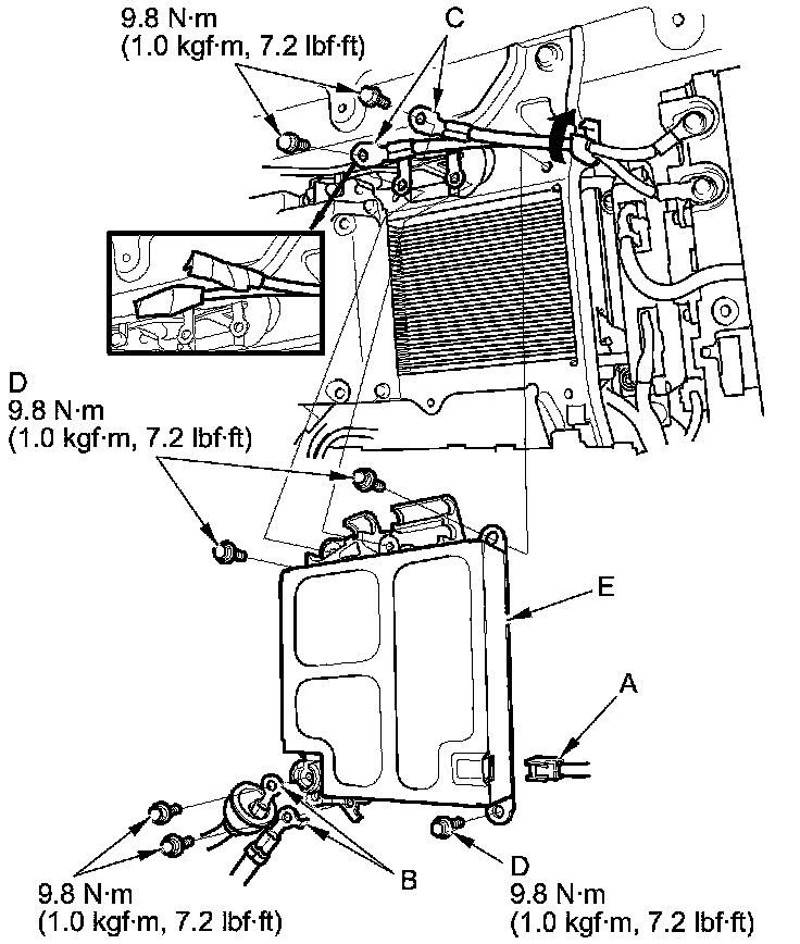 6. Remove the bolts (D), and the DC-DC converter (E).