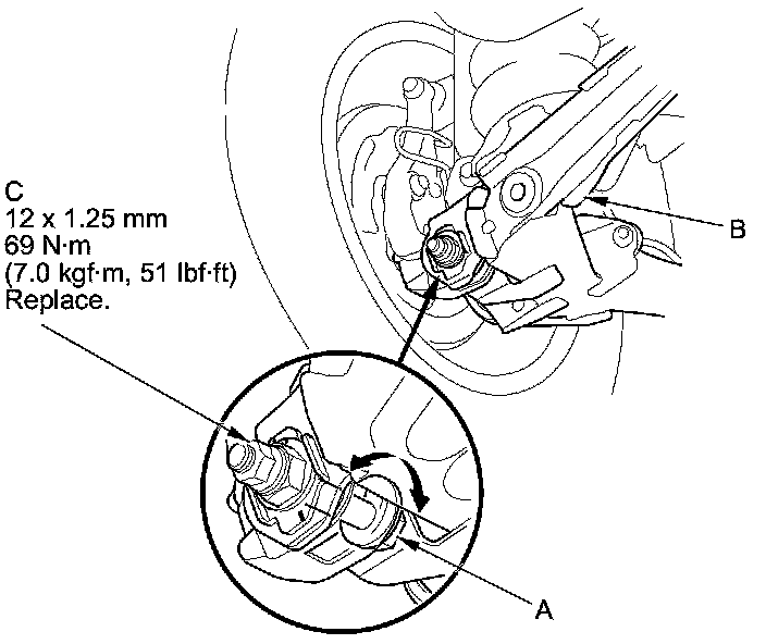 3. Hold the adjusting bolt (A) on the trailing arm (B), and loosen the self-locking nut (C).