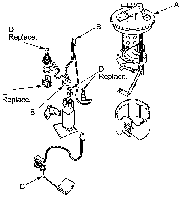 4. Install the parts in the reverse order of removal with new O-rings (D) and a new bracket (E). When installing the fuel tank unit, align the marks on the unit and the fuel tank Fuel Tank Unit Removal/Installation.