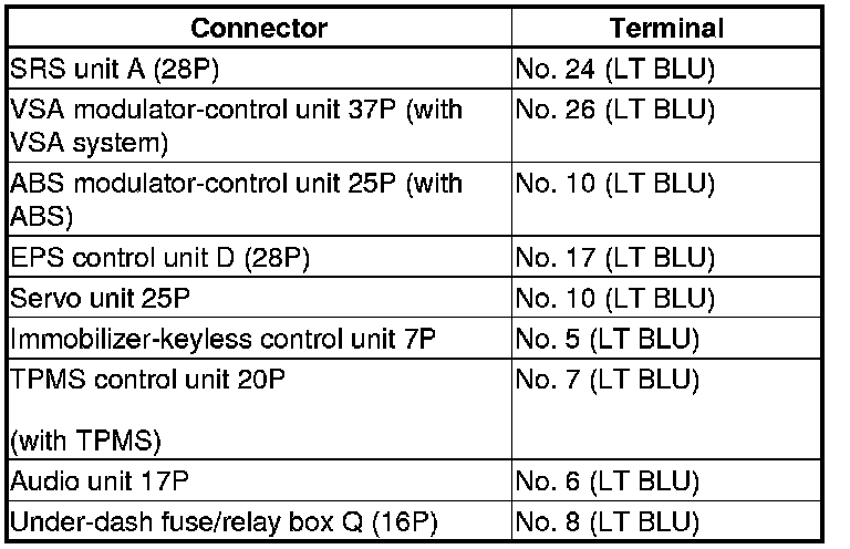 Repair short in the wire between the DLC (K-line) and the VSA modulator-control unit, or the ABS modulator-control unit, the EPS control unit, the servo unit, the SRS unit, the immobilizer-keyless control unit, the TPMS control unit (with TPMS), the audio unit, or the under-dash fuse/relay box.�