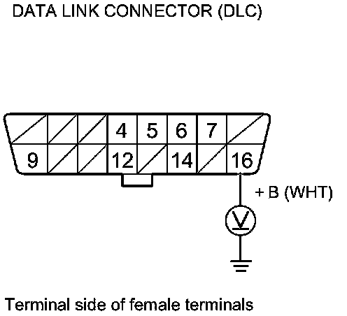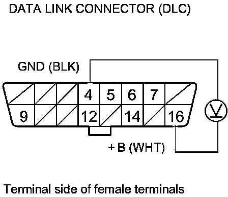 31. Measure the voltage between DLC terminal No. 16 and body ground.