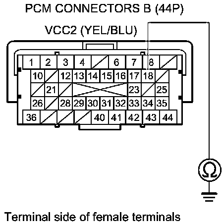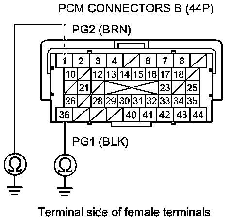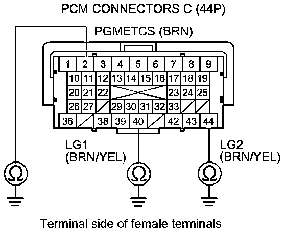 73. Check for continuity between body ground and PCM connector terminals B1, B36, C2, C40, and C44 individually.