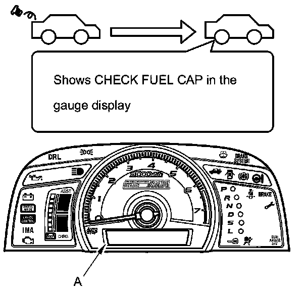 The first time a leak is detected a CHECK FUEL CAP message appears in the gauge display (A). To scroll to another message, press the select/reset button. The CHECK FUEL CAP message appears each time you restart the engine until the system turns the message off. Turn the engine off then replace or tighten the fuel fill cap until it clicks at least once.