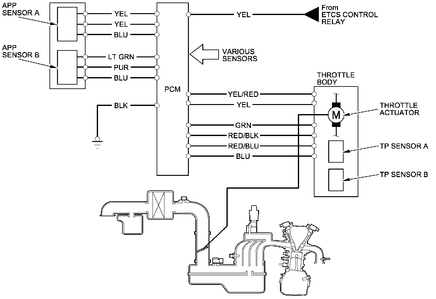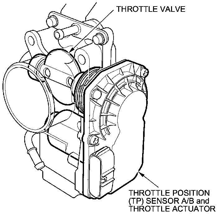 The electronic throttle control system consists of the throttle actuator, throttle position (TP) sensor A/B, accelerator pedal position (APP) sensor A/B, the electronic throttle control system (ETCS) control relay, and the PCM.