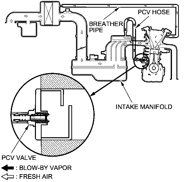 The PCV valve prevents blow-by gasses from escaping into the atmosphere by venting them into the intake manifold.