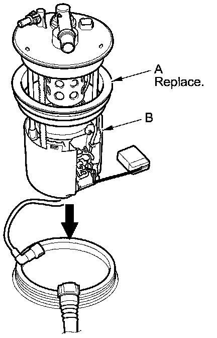 1. Temporarily attach a new base gasket (A) to the fuel tank unit (B), then insert the fuel tank unit partially into the fuel tank.