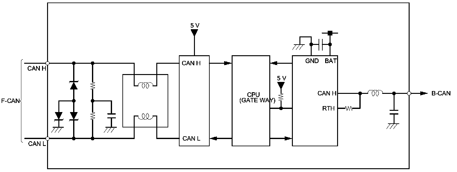 The body controller area network (B-CAN) and the fast controller area network (F-CAN) share information between multiple electronic control units (ECUs). B-CAN communication moves at a slower speed (33.33 kbps) for convenience related items and for other functions. F-CAN information moves at a faster speed (500 kbps) for " real time" functions such as fuel and emissions data. To allow both systems to share information, the gauge control module translates and relays the information from B-CAN to F-CAN and from F-CAN to B-CAN. This is called the Gateway Function.
