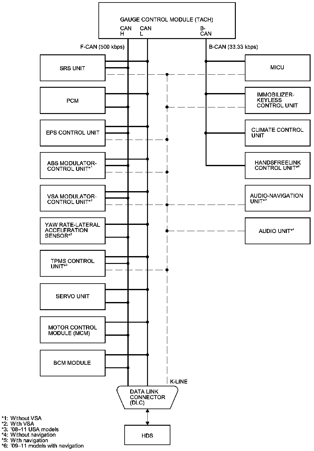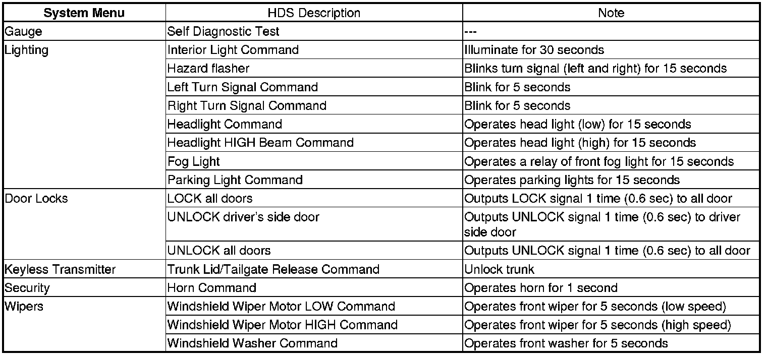 By connecting the HDS to the data link connector (DLC), the HDS can retrieve and indicate the diagnostic results from the MICU via a diagnostic line called the K-LINE. The K-LINE is a separate communication lines from the CAN line, but it is connected to most of the CAN related ECUs. The MICU is a gateway between the HDS and B-CAN related ECUs, and sends B-CAN diagnostic information to the HDS. When doing a function test with the HDS, the HDS sends an output signal through the K-LINE to the MICU. The MICU either relays the request to another ECU, or commands the function itself.