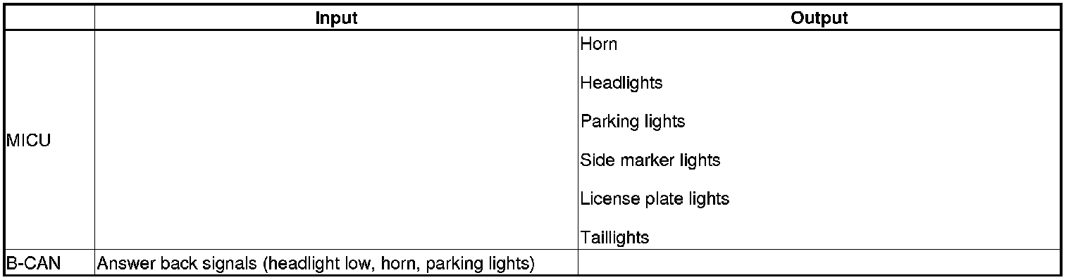 The MICU control of the exterior lights and horn is based on keyless signals sent by B-CAN data.