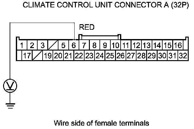 11. Measure the voltage between climate control unit connector A (32P) terminal No. 6 and body ground.