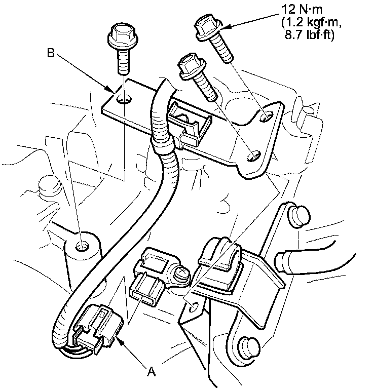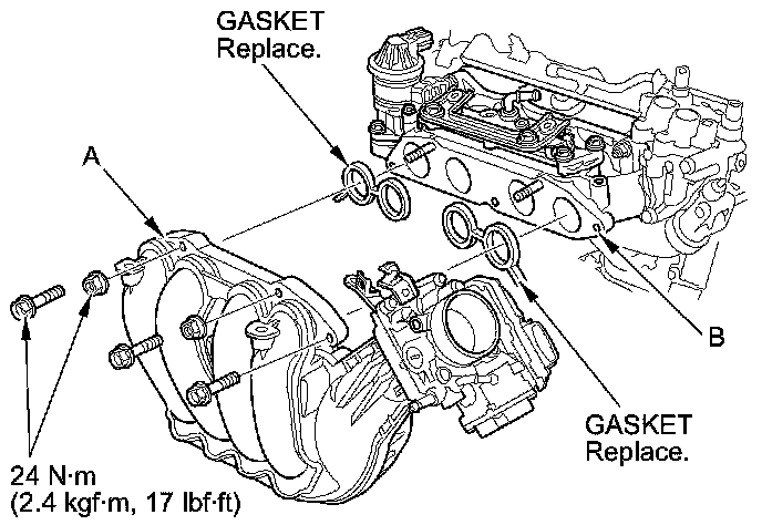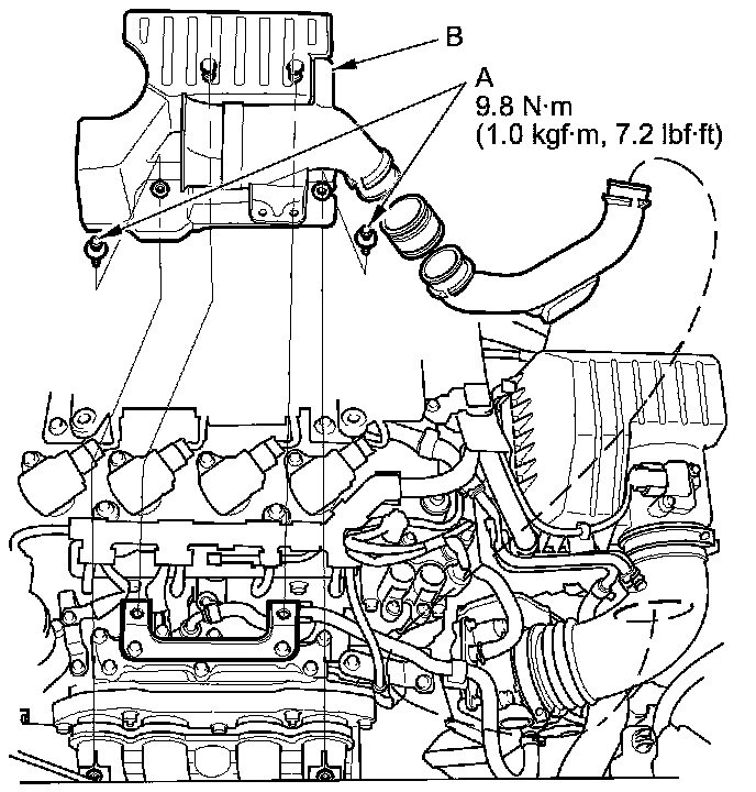 1. Remove the intake air resonator mounting bolts (A), then remove the intake air resonator (B).