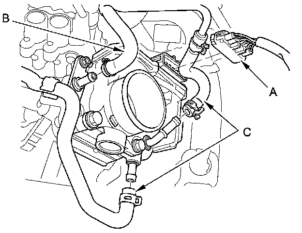 4. Disconnect the throttle body connector (A), the EVAP hose (B), and the two coolant bypass hoses (C) from the throttle body. Plug the lines to prevent coolant from leaking out.