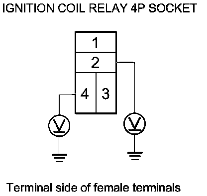 3. Measure the voltage between ignition coil relay 4P socket terminal No. 2 and body ground, then terminal No. 4 and body ground.