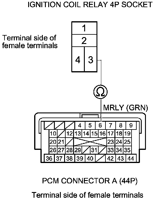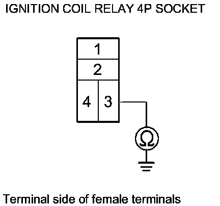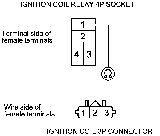 4. Check for continuity between ignition coil relay 4P socket terminal No. 1 and ignition coil 3P connector terminal No. 3.